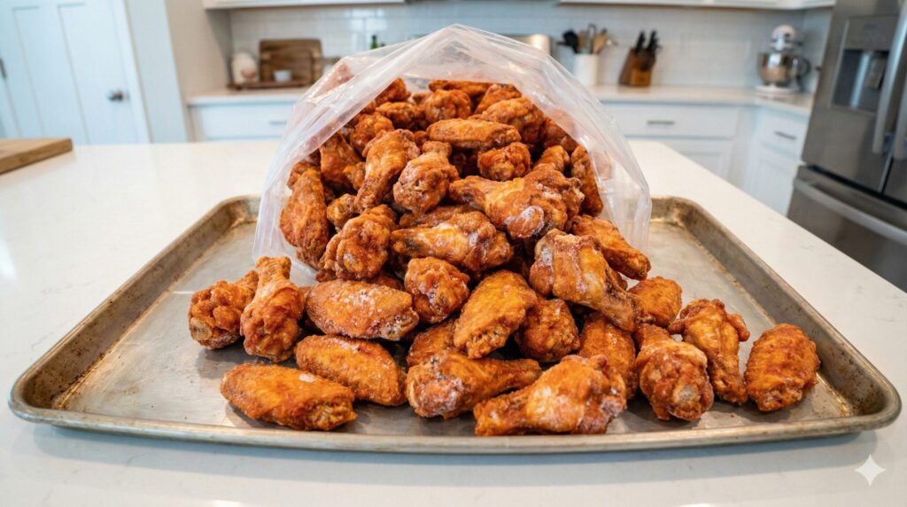 1袋の中には、目安として約35〜45本前後のチキンが入っています。これは重量(1.5kg)を基準にパッキングされているため、1本ずつの大きさによって本数には個体差が生じますが、平均すると40本程度であることが多いようです。店舗での販売価格は税込2,200円前後(※時期や店舗により異なる場合があります)とされており、これを本数で割ると、1本当たりの単価は約55円前後となります。店内のメニューでは4本入りで300円、つまり1本75円ですから、冷凍で購入する方が1本あたり約20円もお得になる計算です。40本分に換算すれば、トータルで800円分もの差が生まれるわけですね。