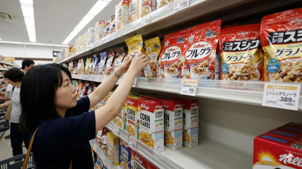 物理的にお店に置かれなくなった背景には、シリアル市場の勢力図がこの10年で激変したことがあります。現在はコーンフレークよりも、カルビーの「フルグラ」に代表されるグラノーラ製品です。店舗の棚割り(どの商品をどこに置くかという計画)は、POSデータに基づいた「売れ筋」が優先されます。