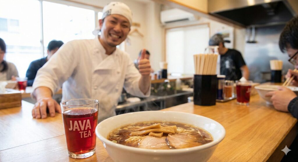 ジャワティーが35年以上愛され続ける最大の理由は、その圧倒的な「テーブルドリンク」としての完成度です。ラーメン界の至宝と呼ばれる「飯田商店」の店主がジャワティーとのペアリングに言及したことでも知られています。繊細な醤油ラーメンの出汁の香りを壊さず、かつ濃厚なチャーシューの脂をさらりと流してくれる。この絶妙な関係性は、他の飲み物ではなかなか代えがたいものです。
