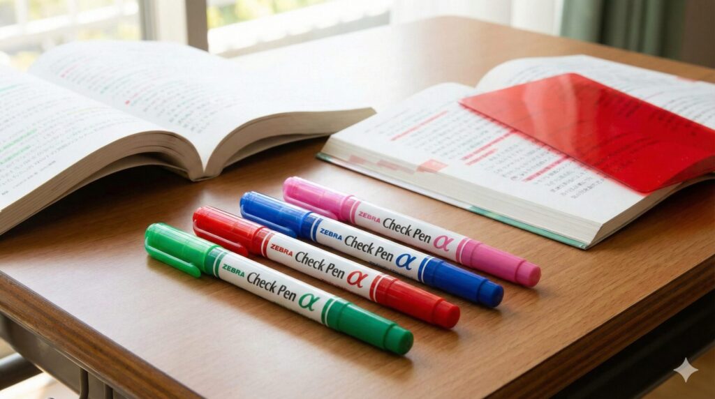 私が個人的に一番推したいのは、従来のチェックペンではなく「チェックペンアルファ」です。昔ながらのチェックペンは、インクが非常に濃く、辞書や薄い参考書の紙だと裏側にガッツリ色が抜けてしまうという「裏写り」の問題がありました。せっかく引いた線が裏側のページまで汚してしまうのは、勉強のモチベーションを下げてしまいますよね。