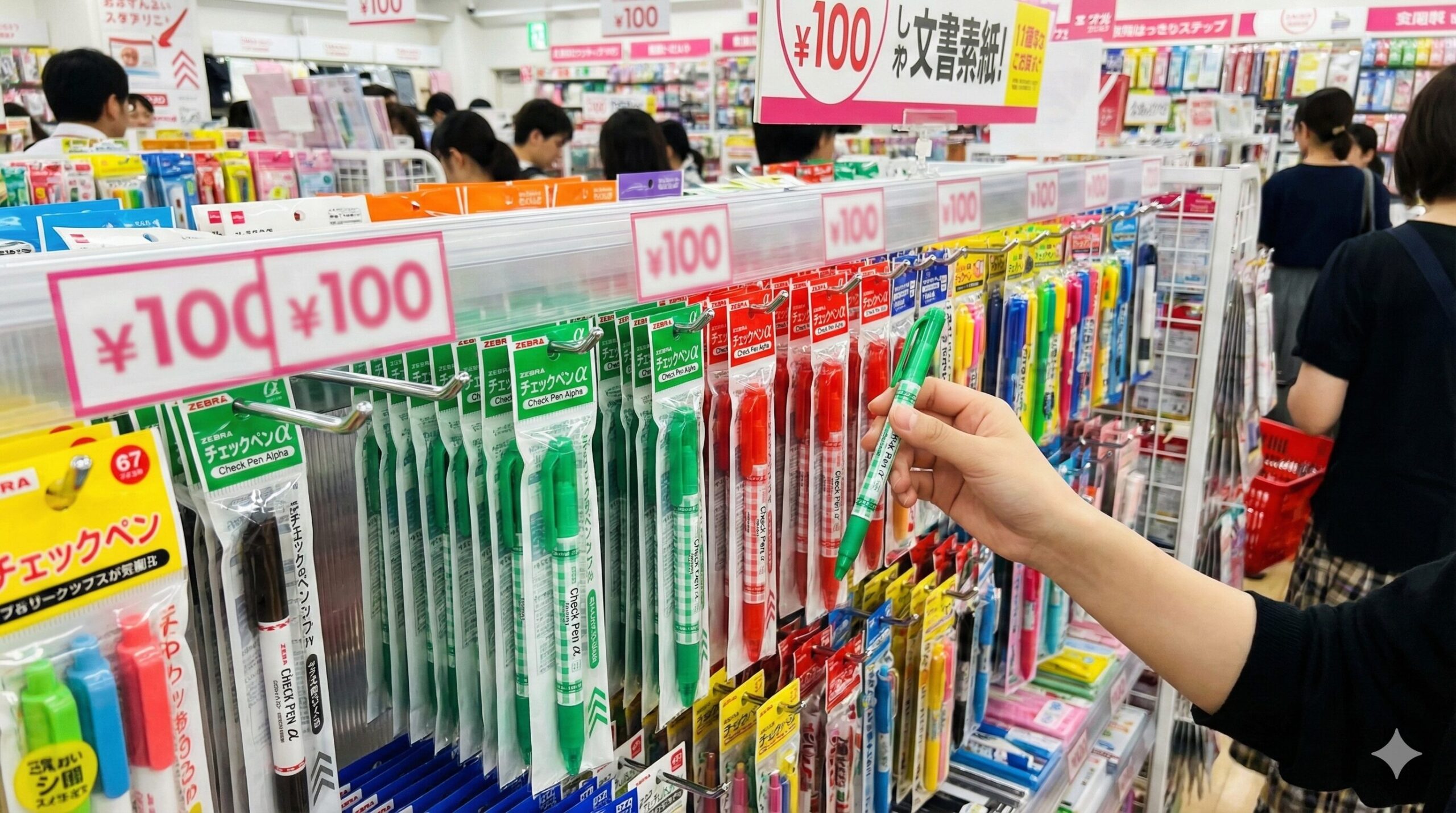 一番のおすすめは、まずは近くのダイソーをチェックすることです。運が良ければ、高品質なチェックペンアルファが100円で手に入ります。一方で、コンビニは自社ブランドや他社提携品が中心なので、ゼブラ指名ならあまり期待できません。