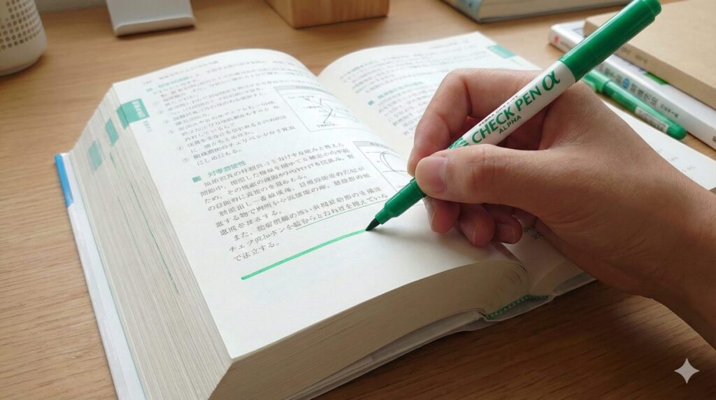 その点、チェックペンアルファはインクが改良されており、本当に裏写りしにくいんです。さらにペン先がナイロン製の「しなる素材」でできているのも大きなポイント。分厚い参考書の、中央付近の曲がった部分でも、ペン先が吸い付くようにピタッとフィットして、ブレずに綺麗な線を引くことが可能です。この使い心地を知ってしまうと、もう旧モデルには戻れません。